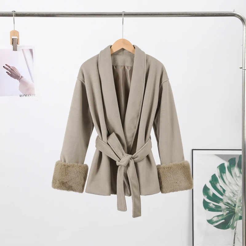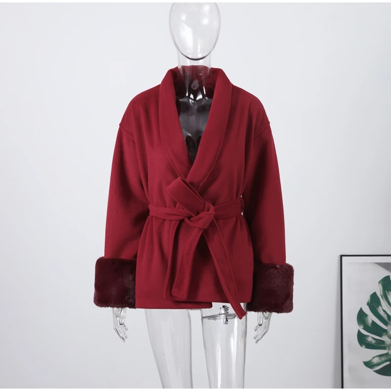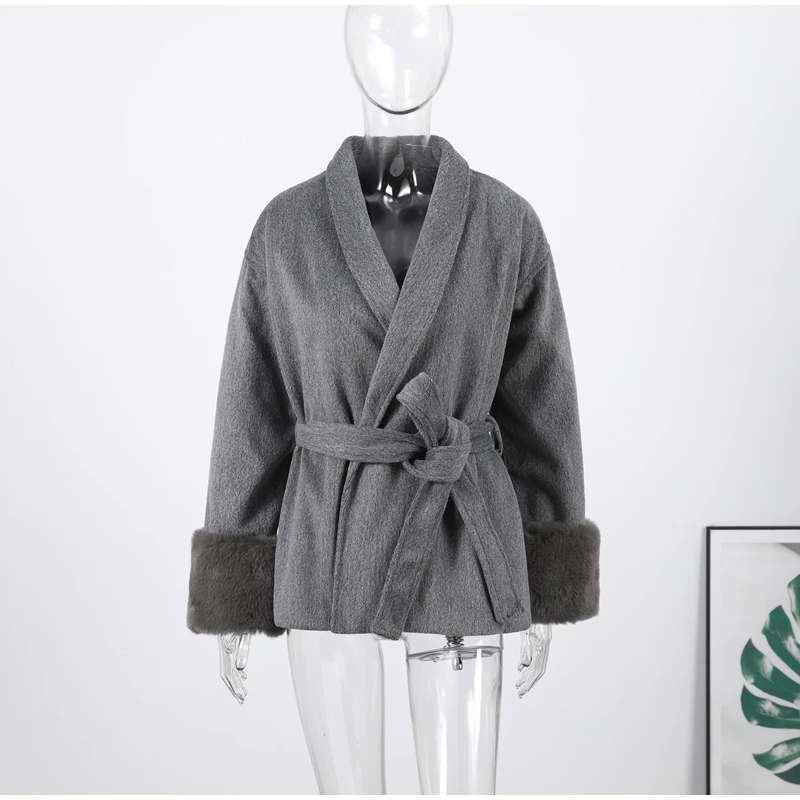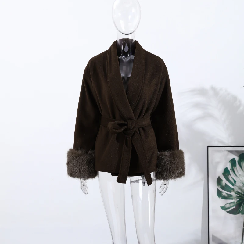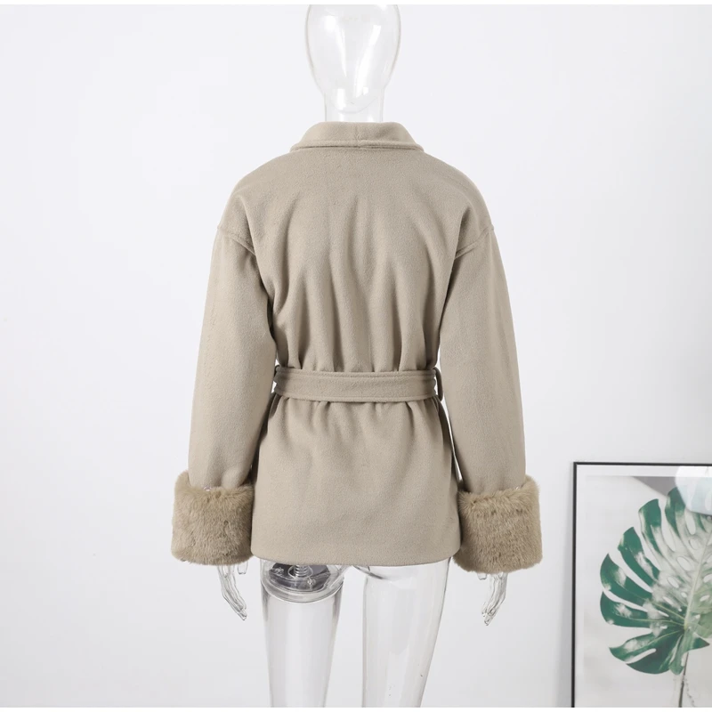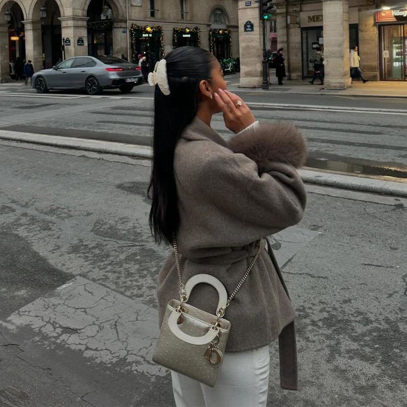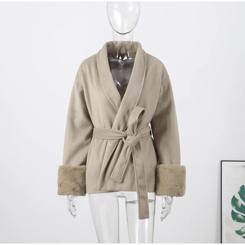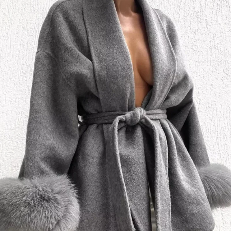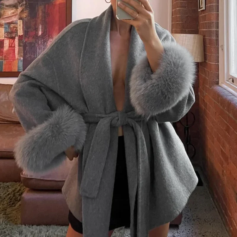 Elegant Lace Up V-neck Coat Women Loose Solid Long Fur-trimmed Sleeve Open Stitch Coats Female 2025 Autumn Fashion Lady Jacket