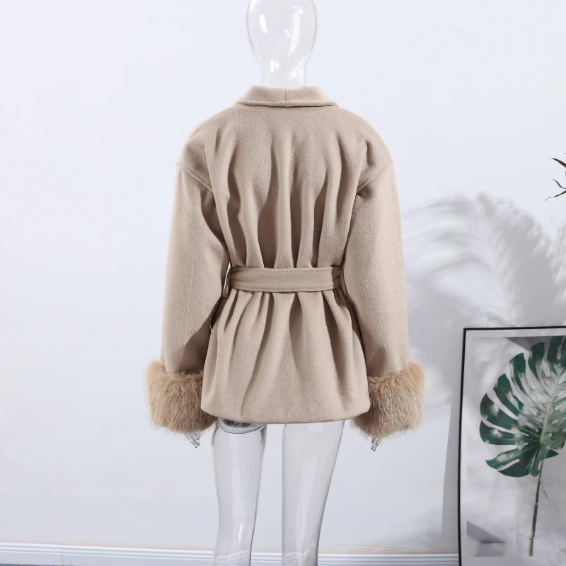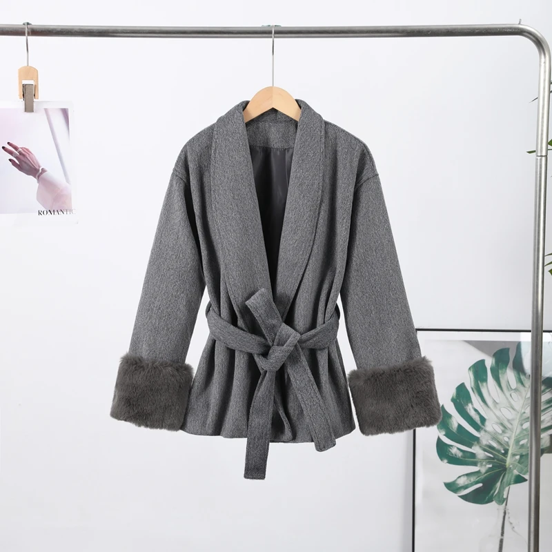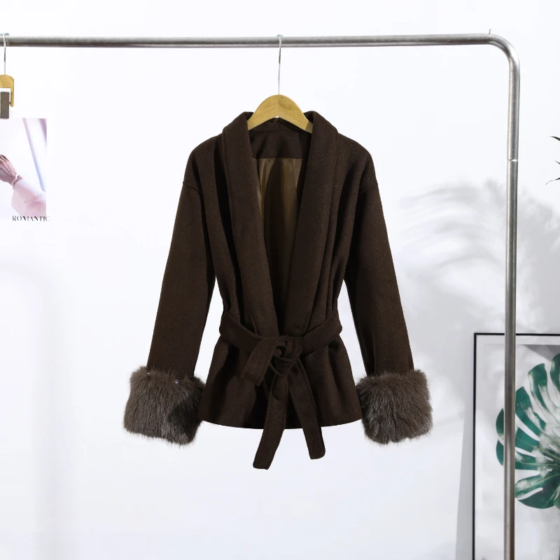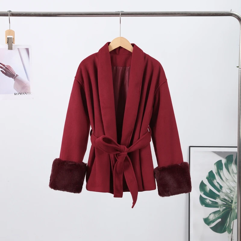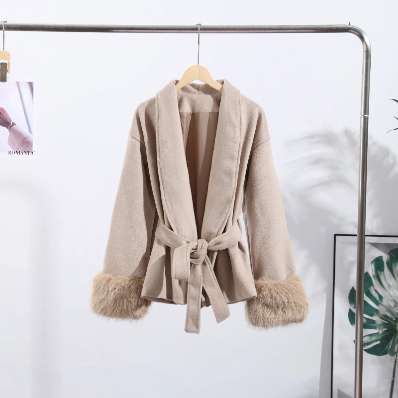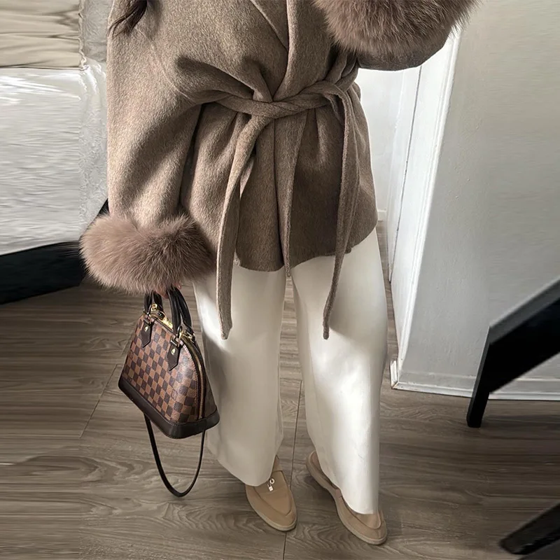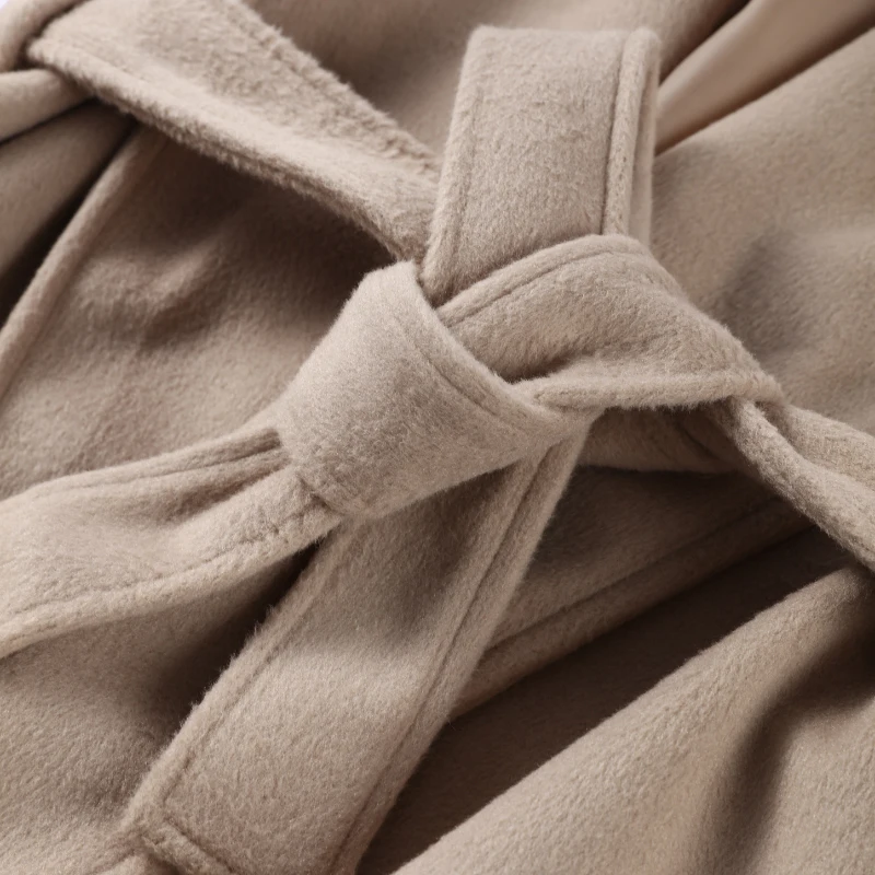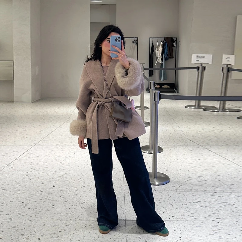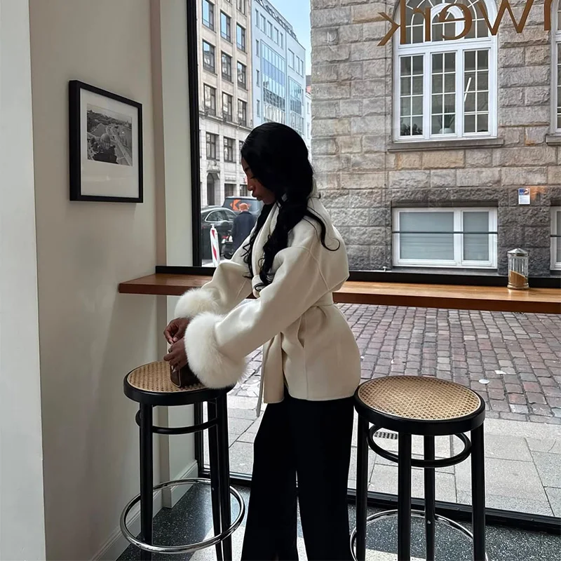 Elegant Lace Up V-neck Coat Women Loose Solid Long Fur-trimmed Sleeve Open Stitch Coats Female 2025 Autumn Fashion Lady Jacket